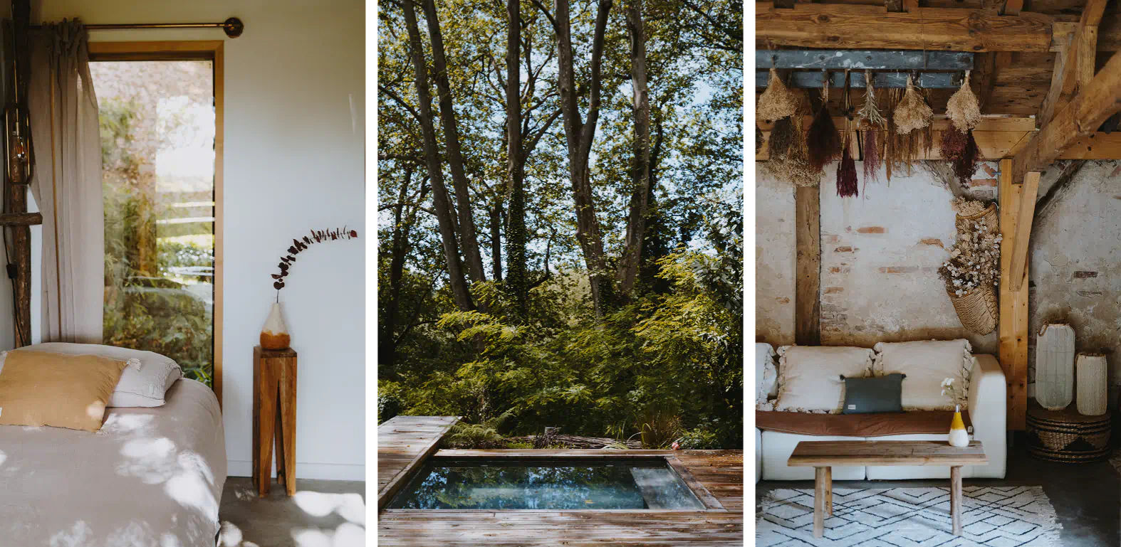 Le Coco Barn Lodge propose des lodges à l’esprit bohème et naturel, mêlant bois brut, teintes douces et lumière apaisante. Chaque espace invite à la déconnexion : linge en gaze de coton, mobilier et décoration soignés, et vues apaisantes sur la nature environnante. Certaines chambres s’ouvrent sur la forêt ou le ruisseau. Ici, on s’endort au son du vent et on se réveille au rythme des oiseaux.