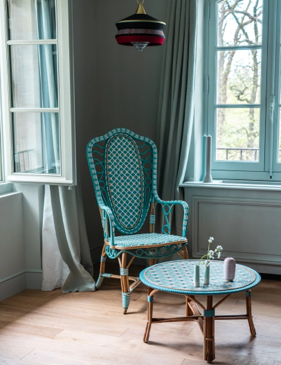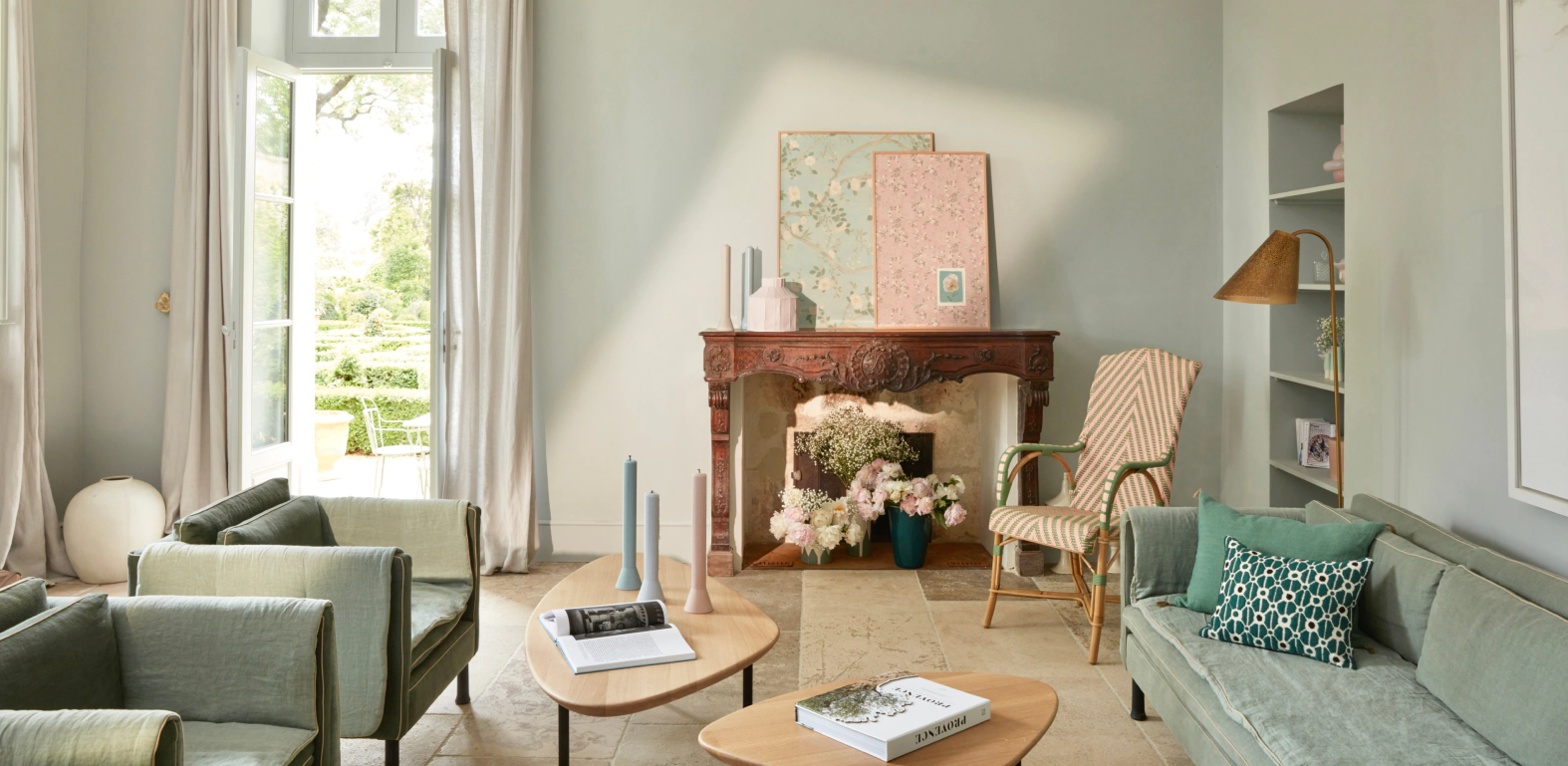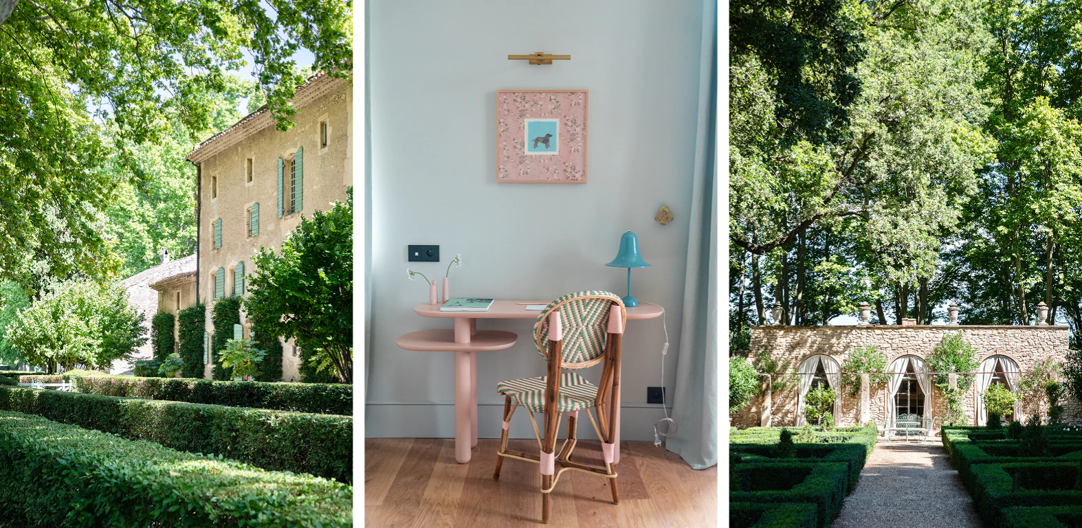 Les 5 chambres et 4 bastides affichent de vastes volumes et de hauts plafonds. Style épuré, murs pastel anis ou bleu pâle, mobilier en rotin blond et salles de bain en grès Vicalvi composent des espaces apaisants. Des touches artistiques et design : suspensions Margaux Keller, assises Maison Drucker ou céramiques Paola Paronetto, insufflent humour, poésie et délicatesse.