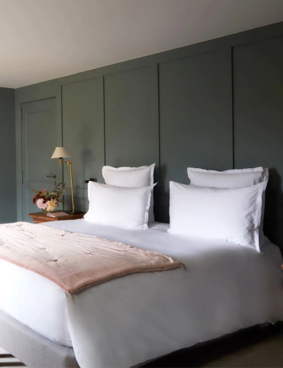 Sur 17 hectares de nature, quatre bâtisses accueillent les voyageurs : la Maison sur Eure, la Maison du Lac, la Maison du Verger et le Barn. Chaque chambre, décorée dans une harmonie de tons clairs et de verts profonds, reflète l’esprit paisible du domaine.