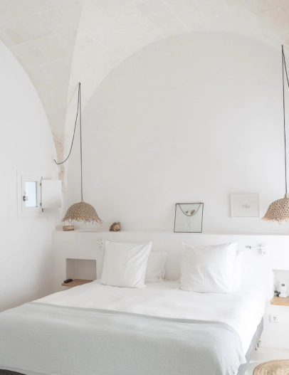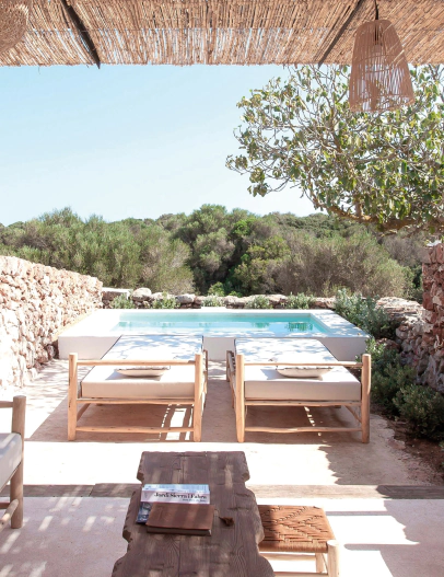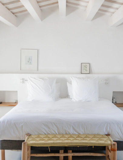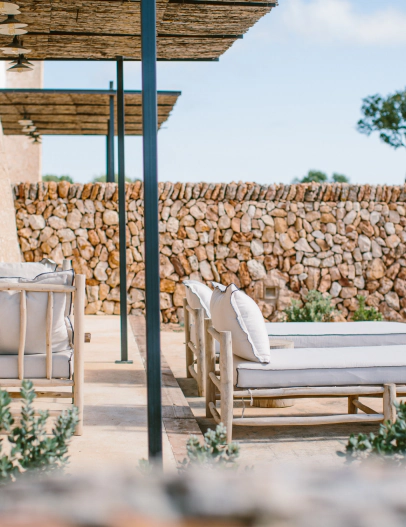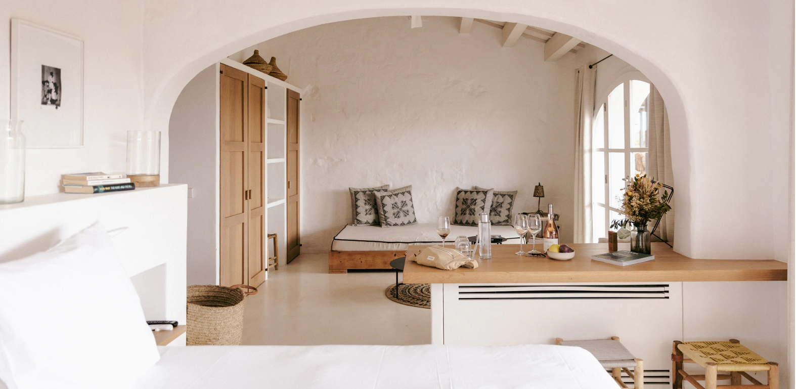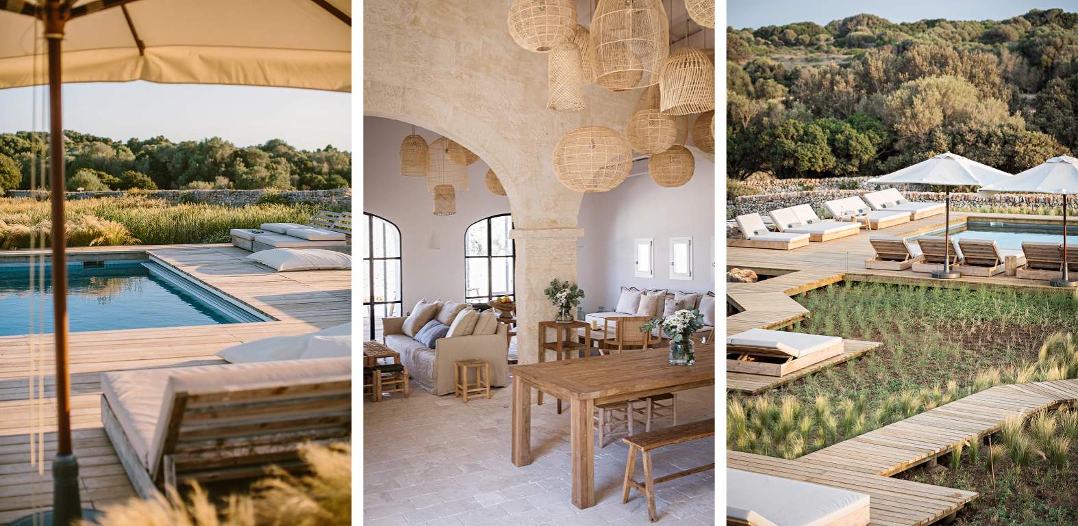 Les 17 chambres et suites se répartissent entre la maison principale, les anciennes granges et de petites maisons indépendantes. Béton ciré, bois flotté, fibres naturelles et terrasses baignées de lumière signent une atmosphère bohème chic. Les suites avec piscine privée constituent un atout rare et exclusif à Minorque.