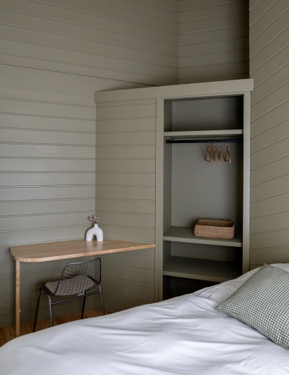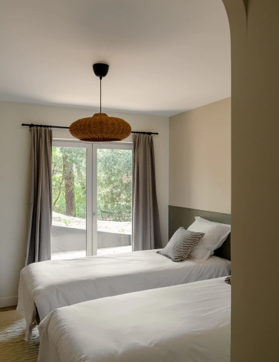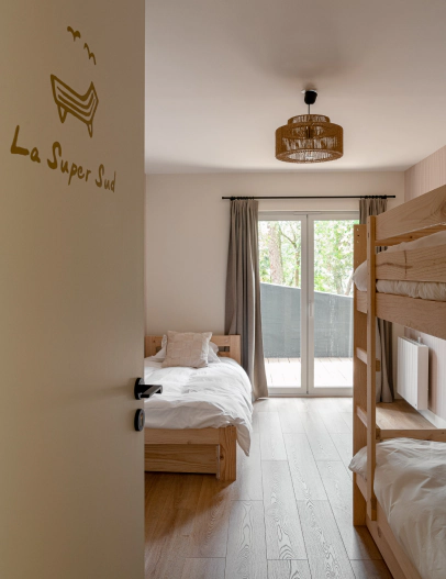 Ici, chaque chambre a été conçue pour s’adapter aux tribus d’aujourd’hui : familles en vacances, amis de toujours ou équipes en séminaire. Les quatre chambres parentales sont toutes modulables : lit double queen-size ou deux lits simples. Grandes fenêtres, rangements malins, ambiance boisée et apaisante… Les deux dortoirs réinventent le genre : pensés pour accueillir des adultes ou ados ou enfants, ils sont chacun équipés de lits superposés confortables (matelas Tediber). On y papote tard, on y rit fort, on y crée des souvenirs.