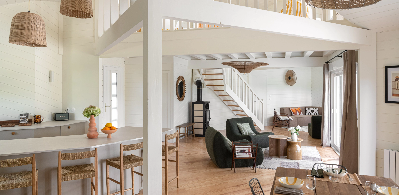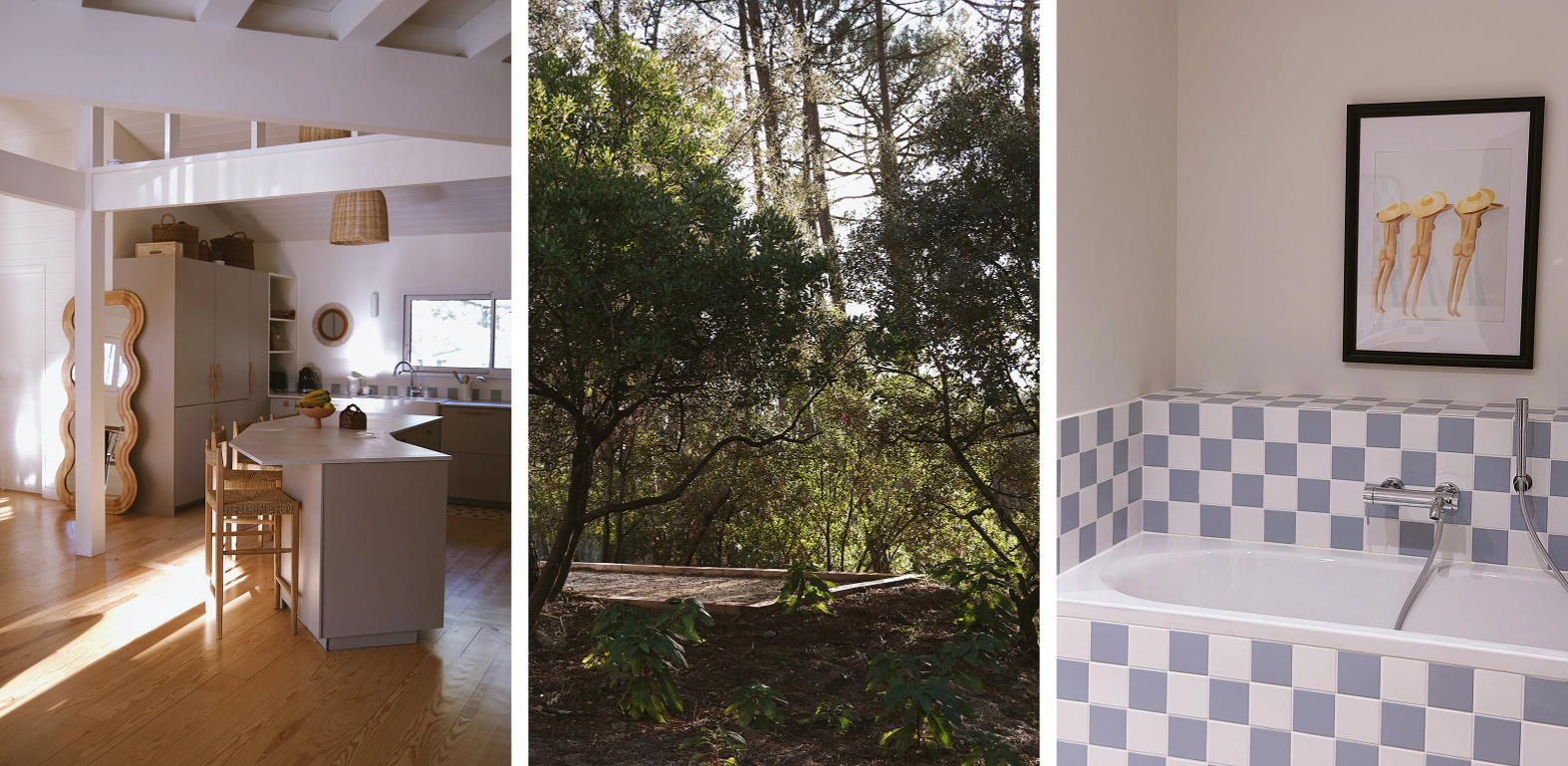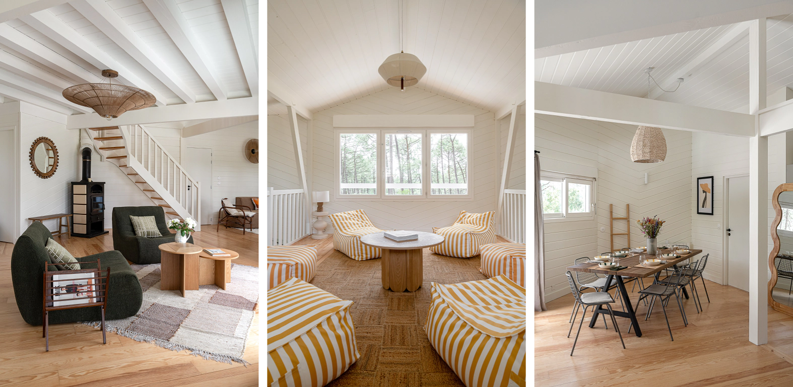 Nichée à Lacanau, sur le golf, à quelques pas des plages océanes et du lac sauvage, cette grande maison en bois offre une vue incroyable sur les pins. Elle a été pensée comme un refuge joyeux pour les tribus : familles nombreuses, bandes d’amis, surfeurs, golfeurs ou yogis, collaborateurs en quête de calme et de nature.