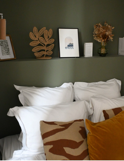 Chez Maison Fernand, deux catégories de chambres vous attendent : Les suites (Rosa Bonheur & Philomène) : généreuses (≈ 45 m²), mêlent tons floraux, textures profondes et touches artistiques. Rosa Bonheur offre même un balcon pour prendre le petit-déjeuner au soleil. Les chambres vue place (Hey James & Oh Georges) : plus compactes (≈ 19 m²), dans une ambiance nature et colorée comme des cocons. Elles offrent toutes un lit double 160×200, une douche à l’italienne, climatisation, wifi, coin bureau, thé & café, produits de salle de bains.