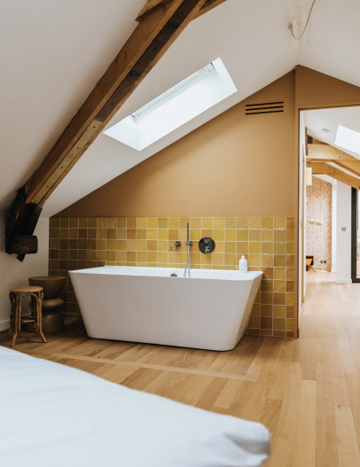 Les suites de Maison Hubert mêlent confort et esprit maison de campagne moderne. Chacune possède sa propre palette de couleurs, ses pièces vintage chinées, et une sélection de matières brutes et naturelles comme le bois et le béton ciré. Spacieuses et lumineuses, elles disposent toutes d’un coffee corner (machine à café Delonghi, réfrigérateur et bouilloire Smeg), d’un salon convivial, de salles de bains privées et de détails pensés pour se sentir à la maison. Les deux maxi suite possède même leur terrasse avec vue imprenable sur Bordeaux.
