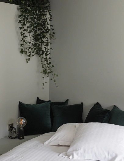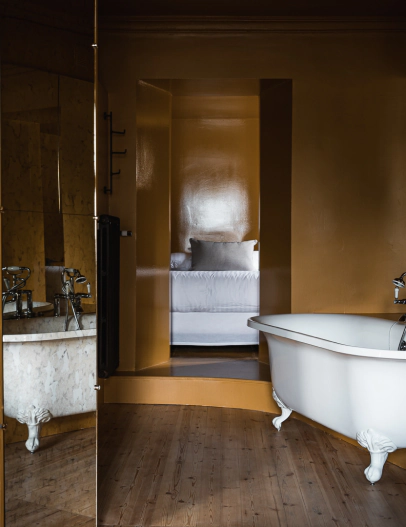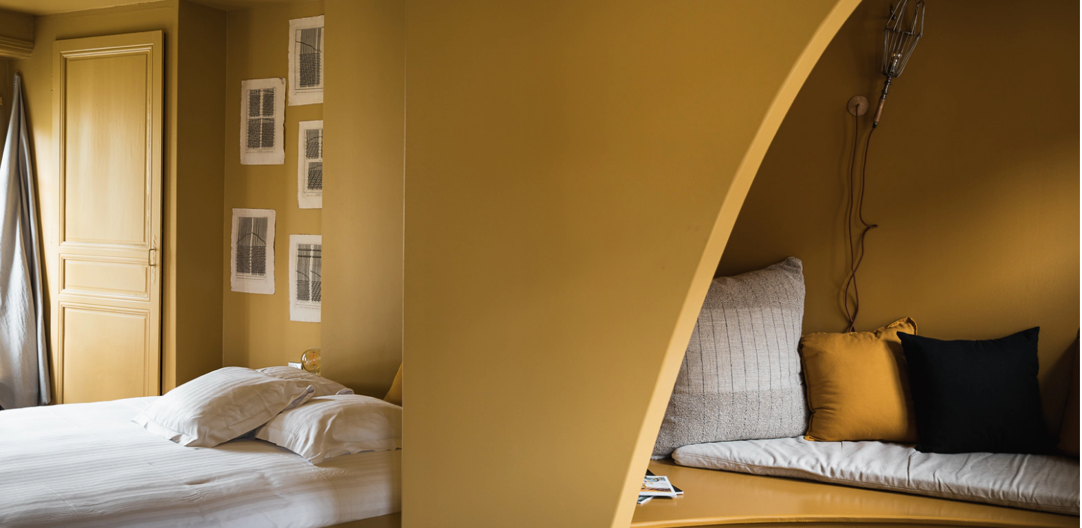 La Couchette s’ouvre en enfilade : on entre par un petit boudoir, on traverse la salle de bain, puis l’alcôve dévoile le lit comme une scène intime et feutrée. La Traversin, vaste et monochrome, baignée de lumière entre ville et jardin, fait face au bain et offre une niche de lecture pour s’évader. La Cachette emprunte un passage secret vers un cocon vert aquatique, étroit et intime, avec douche à l’italienne et baignoire sabot. La Sous-Toit, nichée sous les combles comme un petit appartement, est spacieuse, inspirante, idéale pour créer… ou se reposer longtemps.