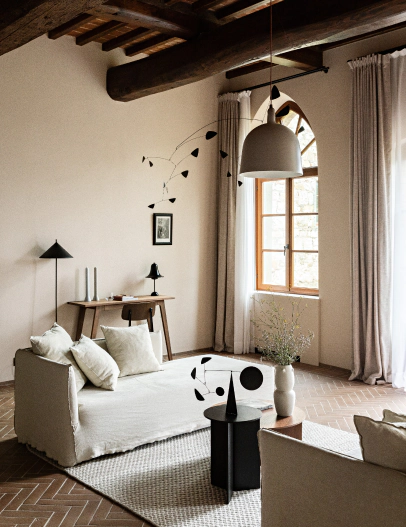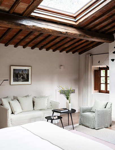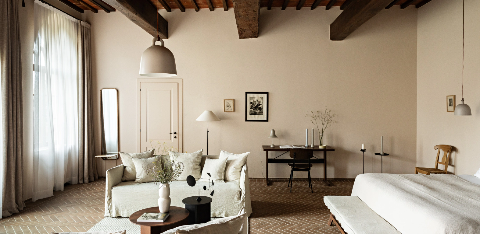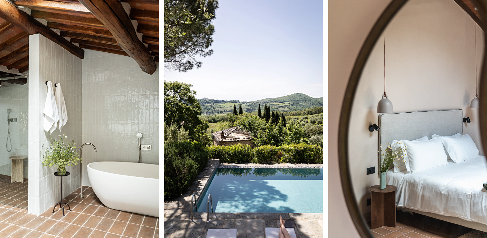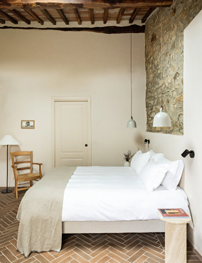 Les 22 chambres et suites se déploient dans quatre bâtisses, avec volumes de 35 à 120 m². Pierres apparentes, charpentes en bois et sols en terre cuite s’ouvrent sur les vignes du Chianti. Chaque espace incarne l’héritage toscan avec élégance.