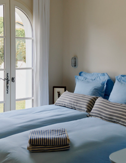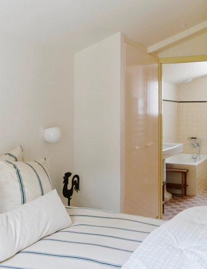 La villa propose 4 chambres qui prolongent un même esprit de douceur maîtrisée et de couleurs réconfortantes. La suite parentale ouvre le bal avec 1 salle de bain années 60, qui réunie baignoire et douche dans un décor ivoire au charme tendre. 1 chambre double discrète et parfaitement calme cultive l’art du minimum juste avec une salle de bain attenante. 1 twin, baignée de lumière, joue les maisons de vacances avec un bleu frais ey accès direct au jardin. Quant au dortoir, il assume son rôle avec simplicité, 3 couchages et une ambiance cabane.